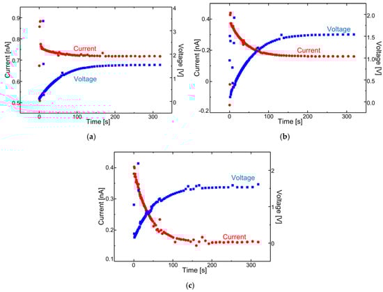 Time-measurement result of current and voltage in alcohol gas. (a) Ethanol, (b) methanol, and (c) isopropyl alcohol.