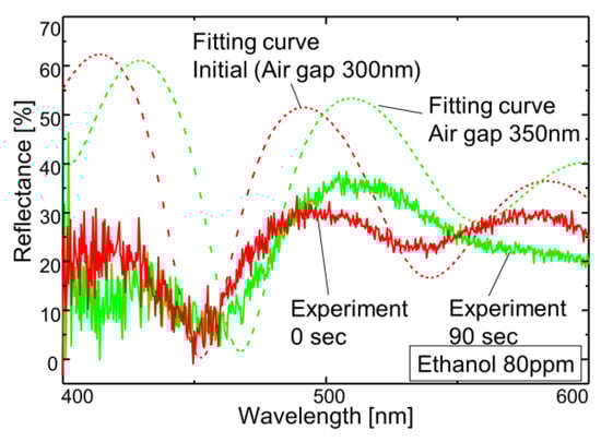 Figure 9 shows the optical interference characteristics of the fabricated sensor using ethanol with a concentration of 80 ppm as well as fitting curves for different air gaps. The analysis parameters are the results obtained when the thickness of the parylene-C film was 350 nm, that of the silicon oxide film was 400 nm, and the air gap changed from 300 nm to 350 nm. The deviation of light intensity is assumed to be due to surface scattering because the short-wavelength light suffers from the surface roughness of the mirror. In this sensor, a change of approximately 1 V is obtained at a displacement of approximately 50 nm, and the conversion efficiency is good. It is considered that the hydroxyl group (–OH) of the alcohol and the amino group (–NH2) of the diX-AM membrane were hydrogen bonded and that the molecules adhered to the sensor film and repelled each other, whereby the membrane bulged. Figure 10 compares the light reflectance with the output voltage when the sensor is irradiated with a 530-nm laser light source. Reflectance at 530 nm was supposed to increase by the spectral shift associated with membrane deformation. The output voltage of the source follower circuit can be detected with respect to the change in reflectance. Hence, the slight deformation of the 50-nm membrane that adsorbs gas molecules was converted to a voltage of 1.5 V in the same manner as in a CMOS image sensor.