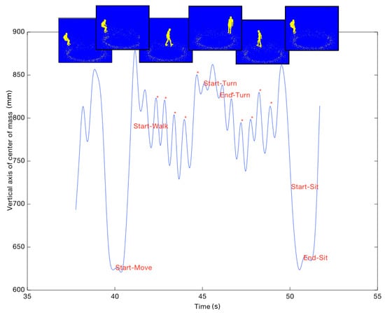 The vertical trajectory of the centroid allowed us to identify the steps of the person. Figure 2 shows the local maxima detected during the walk (indicated by asterisks). One step corresponds to the interval between two local maxima. Step lengths were estimated from the corresponding 3D coordinates of the centroid. This information allowed us to obtain the following additional TUG test parameters: