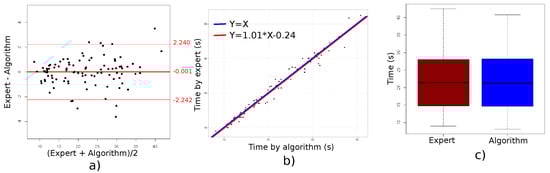 The level of agreement between the algorithm and clinicians measurements was evaluated. Figure 4a shows the Bland and Altman plot for test durations. The mean difference (bias) and the LoA (mean differences ± 2 Standard Deviation (SD)) between test durations estimated by clinicians and our algorithm are shown in Table 2. Clinicians and algorithm provided very similar values (difference of −0.001 s). Moreover, as shown in Figure 4a, most of the points are within the interval given by the LoA. The 95% confidence interval was not reported here because the data was not normally distributed. Finally, the percentage of error (PE) was less than 10.5%.