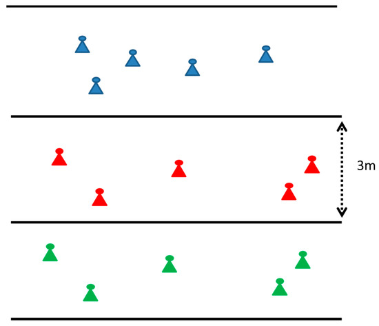 In this section, the simulation framework is provided considering a three-floor building with various sensor nodes per floor (Figure 2). Evaluation is performed with the help of MC simulations, where at each snapshot the nodes per floor can have a different orientation following a uniform distribution. At each snapshot, for every node in the network, the channel coefficient from the central BS is generated for all multipath components, according to the Gaussian distribution as described in Section 2. As explained, this is a rather realistic assumption, due to the number of reflections that take place inside a building. Once these coefficients are generated, corresponding parameters such as total losses are calculated per node. Afterwards, the matrix formulation according to Equations (14) and (15) takes place and overall transmission powers are calculated.
