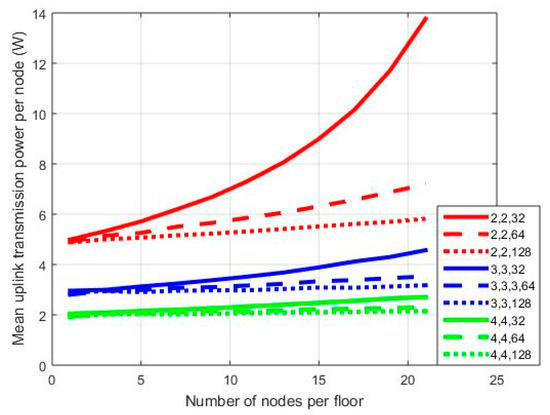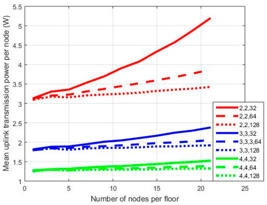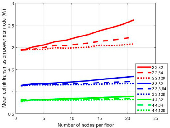 In each graph, where mean transmission power per node is provided on a vertical axis, notation x,y,z stands for the number of transmit antennas/the number of receive antennas/PG. As can be observed in Figure 3, the mean transmission power is higher for the 2 × 2 orientation compared to the other two cases. With 21 nodes per floor and a PG equal to 128 in the 2 × 2 case, the mean transmission power is 2.08 W. The corresponding values for the 3 × 3 and 4 × 4 cases are 1.185 W and 0.8205 W, respectively. Hence, as the order of the MIMO orientation increases (i.e., the number of transmit and receive antennas), the mean transmission power decreases as expected, while this is also the case for the power reduction rate. Moreover, as can be observed from Figure 3, the 2 × 2 case is more vulnerable to PG variations. For PG = 64, the mean transmission power is 2.23 W, while the corresponding value for PG = 32 is 2.614 W. Hence, in the first case, we have an increment of 7% compared with the transmission power for PG = 128, and this increment further increases to almost 26% in the second case (i.e., PG = 32). When more antennas are added at both ends of the MIMO link, this increment is significantly lower, especially in the 4 × 4 orientation. In this case, for PG = 32 and one node per floor mean transmission power is 0.8159 W. For 21 nodes per floor, then this value increases to 0.8944 W. The corresponding values for the 2 × 2 case are 1.944 W/2.614 W, respectively. Hence, as the number of nodes increases, the MIMO order should be increased as well in order to calibrate transmission power increment.