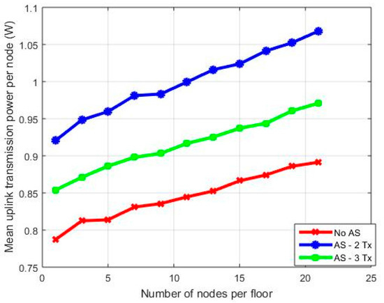 As can be observed from Figure 6, as expected, transmission from all antennas is the best solution in terms of radiated transmitted power. For 21 nodes, when selecting three transmit antennas, the mean transmission power is almost 0.97 W, while the corresponding value for two transmit antennas is 0.89 W. Hence, compared to the case where no AS takes place, in the case of three transmit antennas, we have a power increment of almost 9%, which increases to 19% for the case of two transmit antennas. Note that AS burden is transferred to the BMS central BS, which gathers and processes all channel coefficients and then informs via feedback signals all nodes for the appropriate selection of transmit antennas.
