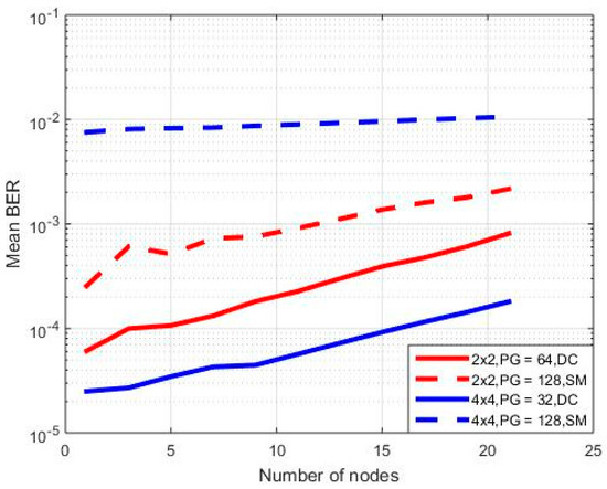 Results are presented in Figure 7, where mean bit error rate (BER) is plotted on a logarithmic scale for the aforementioned cases (DC stands for diversity combining and SM for spatial multiplexing. Details on theoretical BER calculations for spatial multiplexing transmission are provided in the Appendix). Note that, in this particular set of simulations, an SNR of 10 dB has been considered and a building orientation with one floor. Mobile nodes may vary from 1 to 21, as in the previous set of simulations, with a step of 2. Finally, the power per node in the spatial multiplexing cases (2 × 2 and 4 × 4) has been set to be double the value of the corresponding power in diversity combining mode for a 1 × 2/2 × 4 MIMO system, respectively, as now the diversity order of the system is reduced to half. As can be observed in Figure 7, in all cases of mobile nodes, spatial multiplexing transmission worsens the mean BER. This result is rather expected, as spatial multiplexing can be severely affected both by MAI and multiple reflections in indoor environments [22]. Note that BER in SM is affected to a greater extent in the 4 × 4 MIMO case, as MAI is the main capacity limiting factor due to the multiple antennas. This particular simulation scenario with four different input streams corresponds to four independent diversity combining cases (i.e., 1 × 4). Therefore, each receive antenna now undergoes a greater amount of interference, as it receives Mt × L independent signals. Hence, diversity combining is the most appropriate solution for this type of communication, especially if we are interested in low-rate communications.