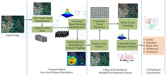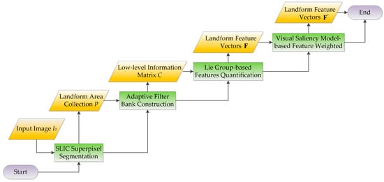 A novel process for superpixel-based feature description is proposed for capturing landforms aerially during scene identification. The process mainly consists of the following steps: simple linear iterative clustering (SLIC) [] based superpixel segmentation, adaptive filter bank construction, Lie group-based feature quantification, and feature weighting based on the visual saliency model (Figure 2). SLIC is used to extract superpixels, whereas filter banking, feature quantification, and feature weighting are conducted to transform the superpixels into feature vectors.