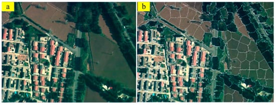 Superpixel segmentation of an aerial image: (a) aerial image; and (b) result of superpixel region segmentation of (a).