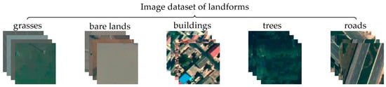 Image dataset of landforms. The landforms are categorized as buildings, trees, grasses, bare lands, and roads.