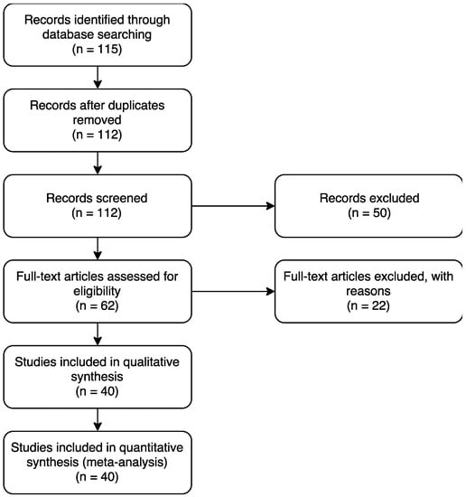 As illustrated in Figure 1, our review identified 115 papers that included three duplicates, which were removed. The remaining 112 works were evaluated in terms of title, abstract, and keywords, resulting in the exclusion of 50 citations. Full text evaluation of the remaining 62 papers resulted in the exclusion of 22 papers that did not match the defined criteria. The remaining 40 papers were included in the qualitative synthesis and the quantitative synthesis. In summary, our review examined 40 papers.