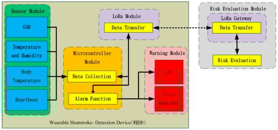 In summary, wearable devices are mainly used for recording the number of exercise steps, distance, path, speed, time, and calories, etc. [11], or monitoring heart rate [8] and measuring the ambient temperature and humidity [12]. They lack early warnings for heat stroke to prevent the user from serious injury while exercising. Heat stroke warnings in wearable devices will enable users who are in a hazardous environment or in poor health be more aware of the risk of heat stroke. To address the hazard of heat stroke for runners, we designed and implemented a wearable heat stroke detection device. The major contributions of this paper include a control method via fuzzy controller for a wearable device and LoRa wireless communication. The device that we proposed can be worn on runners who are engaged in outdoor sports. The user’s heat stroke risk level was calculated using physiological and environmental information collected by the sensor, to warn the user to check their physical state to avoid the occurrence of thermal damage. The device was designed for ease of use of the system easier and to help runners avoid heat stroke.