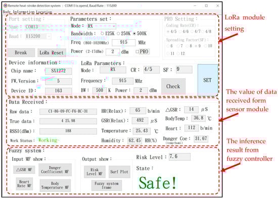 Figure 2 shows the user interface of the risk evaluation module. The interface was mainly divided into three parts: LoRa wireless communication parameter settings, the received physiological information, and the risk level inferred by fuzzy controller. We set the suitable LoRa communication parameters through the user interface to allow the wearable devices to obtain information and send it back to the terminal for analysis. The user interface shows the user’s risk level of heat stroke.