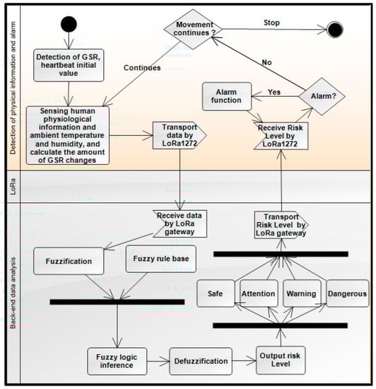 Figure 3 shows the system algorithm using unified modeling language (UML). The system that is proposed in this paper aims to address the heat stroke detection and prevention methods and processes. First, the system measures the initial galvanic skin response (GSR) value and heart rate, and then begins to measure the runner’s physiological information using the IL-LoRa 1272 module to send data to the LoRa gateway. This physiological information is fed into the fuzzy controller to infer the risk of heat stroke. Finally, the alarm module will respond according to the risk level to activate to alert the user.