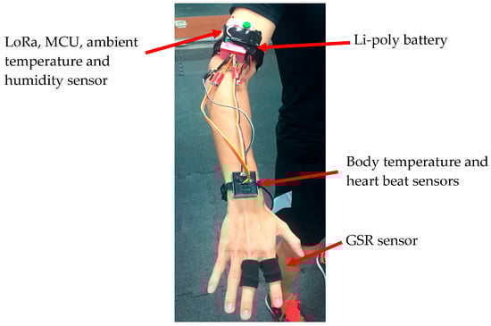 Figure 4 shows the WHDD actual wearing condition that includes three components. The first is wearing the arm of the integrated LoRa wireless communication module, micro-controller, ambient temperature, and humidity sensor, and the alarm module device. Second is the integration of GSR, heartbeat, and the body temperature sensor worn on the ulnar head [12], which is the best position for human physiological information measurement. Adequate soft tissue is present in this position, for both position size and radius, to allow for non-intrusive photo plethysmography (PPG) measurements to successfully measure heartbeat and body temperature. The last part is power; we used a 7.4 V Li-poly battery mounted on the arm.