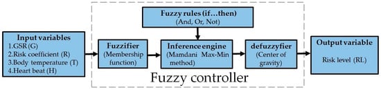 Figure 7 shows a fuzzy controller that is used to achieve the risk evaluation function that immediately informs the user of the risk of heat stroke. The MT2502A microcontroller collects the physiological information, including skin resistance (G), risk coefficient (R), body temperature (T), and heart beat (H) as input variables. Then, using the inference engine for fuzzy logic and using anti-fuzzy to automatically assess the user’s immediate risk level (RL). The risk level is divided into four levels: safe, attention, warning, and prohibition (Table 3), and its membership function is triangular.