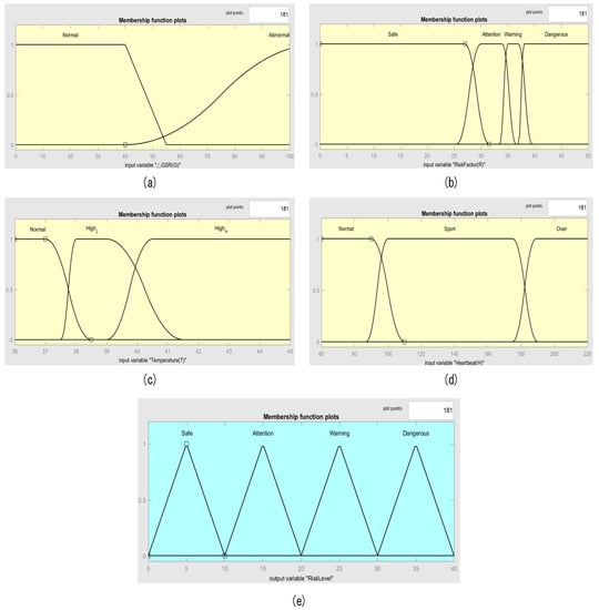 Membership function plot. (a) Galvanic skin response (GSR), (b) risk coefficient, (c) body temperature, (d) heartbeat, and (e) risk level.