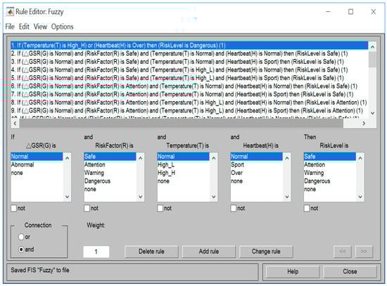 The programming of the rule based in the fuzzy system is complicated, and paying attention to each value and order in the regular array is critical. If the wrong value is inputted, then the system may output the wrong risk assessment. In this paper, we used MATLAB software to build a rule base, because MATLAB provides a graphical editor of the rules. When the range of inputs and outputs has been defined and each set has been named, we could quickly develop or modify the fuzzy controller and reduce the possibility of errors. According to the name of each variable set, Figure 9 describes the 31 rules that we established in this paper. These rules will influence the fuzzy controller to make a decision by inference engine.