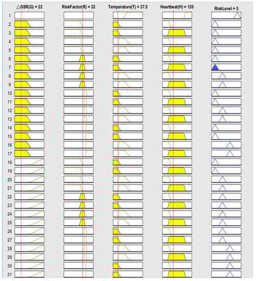 For example, four inputs were entered into the fuzzy controller. We set the variable [ΔGSR(G), Risk factor (R), Body temperature (T), Heart beat (H)] = [22, 32, 37.5, 120] for input data that were entered into the fuzzy controller to calculate. The obtained results are shown in Figure 10. The fuzzy controller used the 31 fuzzy rules that we established to infer the output risk level from four input values. The risk value was five, which corresponds to “Safe” status, and the device will not send anything back to the terminal to alert the runner.