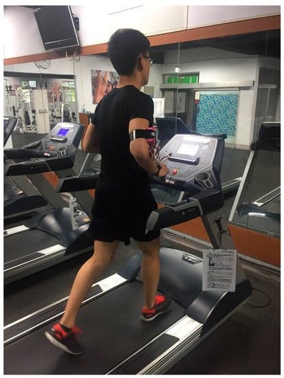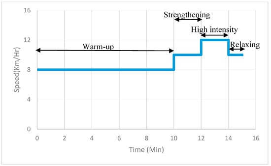 A 35-year-old man with no previous exercise routine participated in this experiment. Figure 11 shows that the participant is wearing the WHDD and running on the treadmill. In the experiment process, we did not open any ventilation equipment or air conditioner so as to avoid affecting the experimental environment. Because we used ambient temperature and humidity to calculate the environmental risk coefficient and both of these variables changed slightly, we only tested the relationship between the sport intensity and two variables: heartbeat and body temperature changes. To create different sport intensities, the runner experienced four stages: warm-up, strengthening, high intensity, and relaxing. Figure 12 shows the speed setting and time configuration of the treadmill. In our experiment, we used three different speeds during a 15-min span. In the warm-up stage, the treadmill speed was 8 km per hour for 10 min. Then, the speed was increased to 10 km per hour for 2 min in the strengthening stage. After that, the treadmill speed was 12 km per hour for 2 min in the intense stage. Finally, the treadmill speed was 10 km per hour for 1 min in the relaxing stage. We used the speed change to verify and determine the effect of exercise intensity on the physiology information.