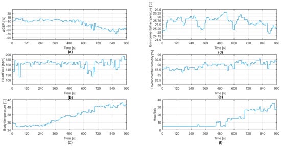 WHDD experiment results, with physiological information about (a) GSR, (b) heartbeat, (c) body temperature, (d) ambient temperature, (e) ambient humidity, and (f) the inferred risk of heat stroke provided by the evaluation system.