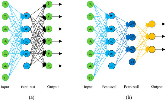 The structure of an AE and a stacked autoencoder (SAE). (a) A three-layer AE; (b) An SAE composed of two autoencoders.