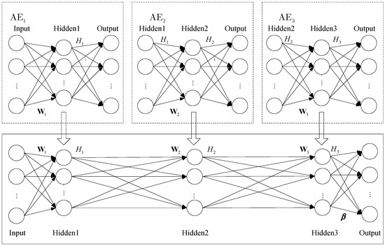 SAE is a neural network consisting of multiple layers of autoencoders, and the structure of an SAE is shown in Figure 3. We can use a greedy layer-wise training method to train SAE; that is, the output of each layer is wired to the input of the successive layer. Then, the BP algorithm is used to fine-tune the whole network.