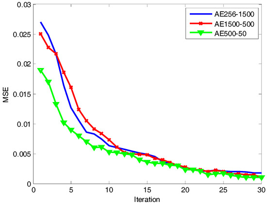 In order to verify the validity of the algorithm proposed in this paper, we compared it with the commonly used methods: PCA [3], MTL TSB-HMMS [6], ELM [26], SAE [21], and DDAEs [23]. The activation function of the hidden layer of ELM is sigmoid and . The regularization coefficient is 0.2. The number of hidden nodes of ELM is 1500. Due to the sample dimension being 256, we set the number of nodes in the visible layer of deep architecture to 256. It is well known that a more abstract feature representation can be obtained with an increase in the network depth. However, too many layers can make the network difficult to train effectively and brings in more parameters to learn. Through the analysis of the experimental data and task requirements, we found that three is a good choice for the number of hidden layers. Therefore, we set the number of hidden layers to be three and the number of nodes in the hidden layers as 1500-500-50, respectively. From Figure 7 we can see that the mean square error (MSE) of each layer reconstruction of the network model decreases with an increase of iterations. When the number of iterations is 25, the MSE is less than 0.003. Therefore, in order to speed up the training, we set the number of iterations in the network to 25.