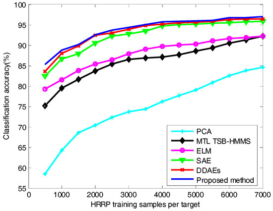 As is shown in Figure 9, as the number of training samples increases, the classification accuracy of different algorithms also increases. However, deep architecture algorithms (e.g., SAE, DDAEs, and the proposed method) are more accurate than shallow architecture algorithms (e.g., PCA, MTL TSB-HMMS, and ELM). The traditional recognition algorithms rely on the experience of the researchers and require a complete set of training samples to ensure excellent recognition performance. Because of the shallow architecture, these algorithms cannot effectively separate the intrinsic class information of the target from some external factors in the feature space. The depth structure algorithms lose the inherent class information of the target as little as possible while demodulating the coupling relationship between various factors layer by layer. More intuitively, the low-level features in the deep network are usually distributed and can be shared among different classes, while the high-level features are usually more abstract and more separable. Therefore, better generalization performance is a great advantage of deep networks. Due to the proposed method not only obtaining the deep feature representation of radar HRRP but also making better use of the target category information, the classification performance of the proposed method is better than that of SAE and DDAEs. In addition, when the training sample is smaller, the classification performance of the proposed method is better than the other algorithms, which shows that the proposed method has better generalization performance. When the number of training samples for each target is 3500, the classification accuracy of different algorithms is listed in Table 2. It can be seen from the table that when the number of training samples is 3500, the accuracy of the proposed algorithm reaches 95.01%, which is 0.22% higher than that of the DDAE algorithm, and 1.5% higher than that of the SAE. The accuracy of the shallow structure algorithms is not more than 90%. It can be concluded that the proposed method can obtain better classification performance when there is only a small amount of training samples available.