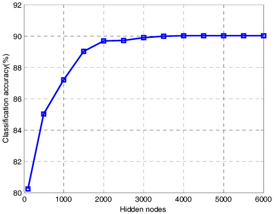 It can be seen from Figure 10 that the classification accuracy of ELM becomes much better as the hidden nodes increase. When the number of hidden nodes is 1500, the classification accuracy is 89.01%. When the number of hidden nodes increases to 4000, ELM reaches an accuracy of 90.01%. After that, the value is almost unchanged all the time because the ELM is in an over-fitting state. Therefore, we know that in order to get a better classification effect, ELM needs more hidden nodes, which will make the network structure more complex. As we know from Table 2, only 50 hidden nodes are required to obtain an accuracy of 95.01% when the proposed method uses regularized ELM for classification. Therefore, the proposed method can effectively reduce the hidden nodes of ELM and simplify the network structure.