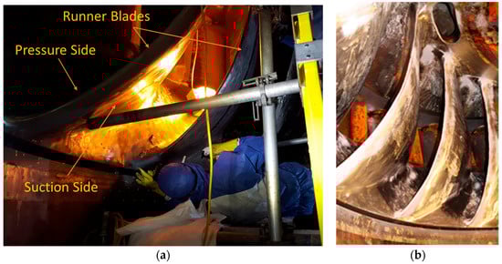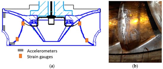Pictures of the Francis turbine runner studied. (a) Picture during the installation of the strain gauges in the runner; (b) detail of the runner blades.