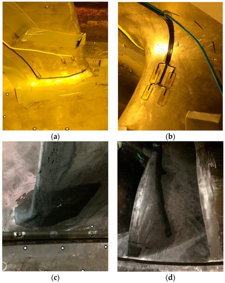 Detail of the strain gauges installed in the runner. (a) Strain gauges in the pressure side and band side; (b) strain gauges in the suction side and crown side; (c,d) detail of the epoxy resin covering the strain gauges.