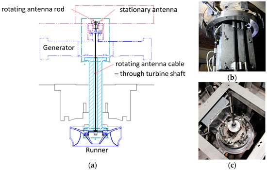 Detail of the telemetry system installed in the rotating train of the Francis turbine. (a) Sketch of the telemetry system; (b) picture of the telemetry system installed in the hub of the runner; (c) rotating antenna at the tip of the shaft.