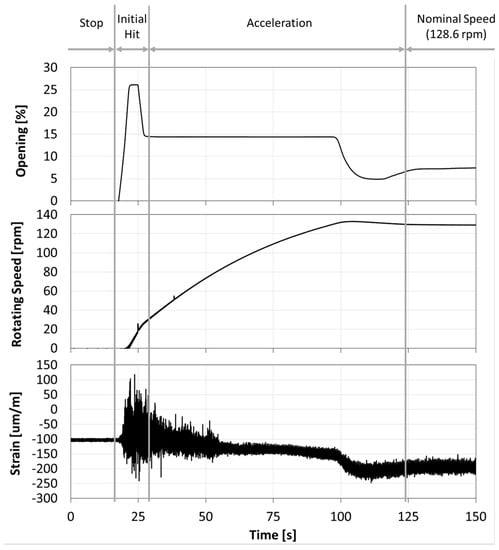 One can understand transient excitations as those that excite the structure during very short periods of time. This is the case of an impact made with an instrumented hammer in an EMA [38]. This kind of excitation is a broadband-type of excitation. In Francis turbines, this type of excitation is found at the very beginning of every transient event (start-up, stop, change in loads…). When the guide vanes start to turn, the flow rate passing through the runner changes, and this may act as an impact over the runner, exciting all its natural frequencies. The faster this process, the stronger the impact on the runner [39]. This phenomenon was previously analyzed in hydraulic turbines by Aguila et al. [40] to detect the natural frequencies of the rotor.