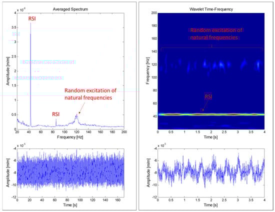 Comparison of an averaged-spectrum analysis (left) and a joint time–frequency analysis using wavelets (right) of a strain gauge signal during deep part load (DPL) operation.