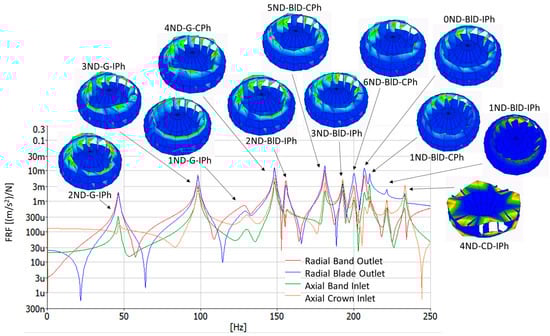 The runner mode shapes, natural frequencies and damping ratios have been identified in air by means of the EMA and the ODS. They have been named according to the nomenclature explained in Section 2.1. Table 2 shows the first 12 mode-shapes, natural frequencies and damping ratios obtained within the frequency range 0–250 Hz with the EMA. Moreover, the ODS of these mode shapes are also seen in Figure 7 and in the supplementary videos S1 to S12 (see Supplementary Materials section). This picture also shows the FRFs of different points of the runner. It is clearly observed that there is a first zone (0 Hz to 150 Hz) where the band outlet deformation and the blades’ deformation is the same, so they have been called global modes (G). Then, there is another zone (150 Hz to 220 Hz) where the blade deformation is higher (BlD modes); whereas the last mode shape present higher deformation in the crown inlet than in the band outlet or the blades. This mode shape has been named the crown dominant mode shape (CD).