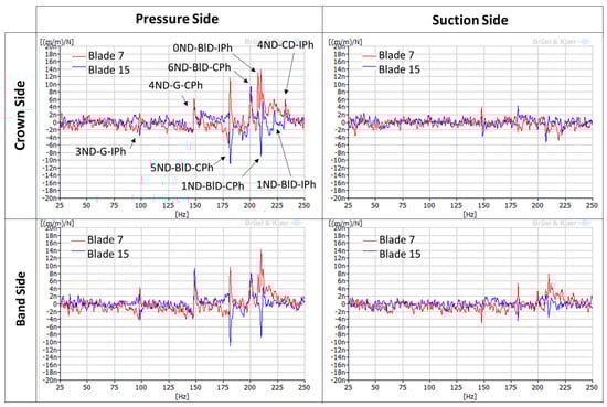 Once the mode shapes and natural frequencies have been identified with the EMA using accelerometers, it is necessary to see how these mode shapes are detected with all the different strain gauges installed in the runner. Figure 8 shows the FRFs of different strain gauges located in the runner when it was impacted in one of the blades, in this case, blade 7. They have been classified according to the side of the blade where they are located (pressure side or suction side) and if they are near the crown or the band (crown side or band side). It can be seen that, depending on the location of the strain gauge, natural frequencies are detected or not, and with different amplitudes. Only the real part of the FRF is shown in the picture to see graphically if the strain gauges of blade 7 and blade 15 (separated by 180°) are in phase or in counter-phase.
