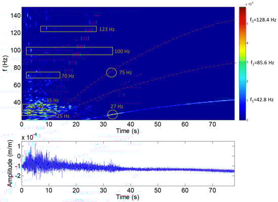 Joint time–frequency plot of a strain gauge signal (crown side, pressure side, blade 7) during DPL (18% of rated power).