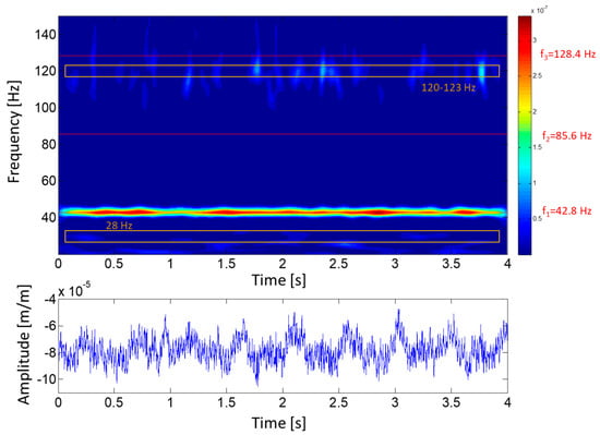 During DPL, where the turbine operates with very low flow and power, the turbulence is one of the most important excitation phenomena (see Section 2.2.3). In this situation, the runner is excited randomly, hence some of its natural frequencies may be detected. Figure 10 shows the joint time-frequency (using wavelets) plot of 4 s of a strain gauge signal during DPL operation. A random excitation of some frequencies in the range of 120–123 Hz and with less amplitude in the zone of 28 Hz can be observed. These frequencies could be natural frequencies of the runner.