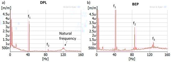 Averaged-spectrum analysis of a strain-gauge signal (crown side, pressure side, blade 7) during (a) DPL (18% of rated power); and (b) best efficiency point (BEP) (90% of rated power).