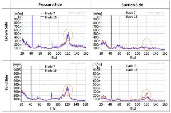 Further analysis using the averaged-spectrum method were also applied to a larger time signal of the same strain gauge (see Figure 11). In this figure, the average of 100 spectra during 170 s was plotted for DPL operation and BEP operation. It can be seen that a zone between 120–123 Hz is clearly excited in DPL, but not in BEP. Moreover, looking at the different strain gauges installed in the runner (Figure 12), it can be clearly observed that this zone (120–123 Hz) is more excited in the pressure side than in the suction side (in the suction side it is only detected in the band strain gauges). This is the same behavior as obtained for the natural frequencies of the runner in air (Figure 8), so it can be confirmed that it is a natural frequency of the runner in water. Moreover, this natural frequency is rather near the third harmonic excitation of the RSI (f3 = 128.4 Hz), which according to Table 1 (column 3) is mainly a kn.m = 4 excitation; so it seems that it is more excited than other frequencies because it may be a 4ND mode shape. According to the natural frequencies in air and previous knowledge about natural frequencies in water of Francis turbines [10,22,23,24], this natural frequency (120–123 Hz) may correspond to the mode shape called “4ND-CD-IPh” in Table 2. This means that this mode shape has a reduction of 52% of the natural frequency in air when in operating conditions.