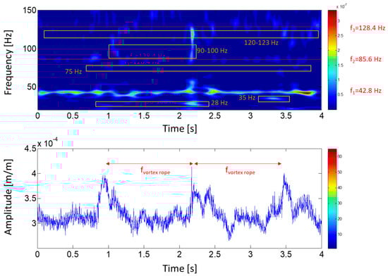 During the OL operation, the runner receives large pressure pulses due to the overload vortex rope, which can act as strong impacts over the structure exciting all its natural frequencies (see Section 2.2.1). Figure 13 shows a joint time–frequency analysis of a strain-gauge signal during 4 s. The strong periodic (fvortex rope) fluctuations due to the vortex rope can be observed clearly in the time plot. Every maximum of these fluctuations correspond to a strong shake of the runner, exciting all its natural frequencies. Different frequencies are excited during this moment: 28 Hz, 35 Hz, 75 Hz, 90–100 Hz and 120–123 Hz.