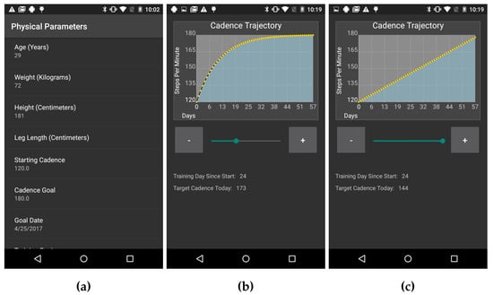 As stated earlier, in the current version of RunningCoach, the cadence training regimen settings are manually set by the runner. Eventually, we aim to develop an algorithm that would recommend, to each runner, her or his ideal cadence level (), and a personalized improvement steepness curve (), that are based on her or his physique profile depicted in Figure 1a as well as data from her or his previous runs. In addition, we aim to use heart rate data to dynamically alter the training regimen for the runner in a way that is sensitive to the runner’s physical ability. In order to achieve this goal, we aim to use the data collected in this study (and the future iterations of this study) to train a recommendation algorithm in a way that mimics the true improvement trajectories of the runners. Further studies are needed to validate the efficacy of such a recommendation algorithm. More details about the adopted training regimen can be found in [,].