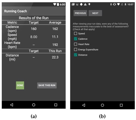 (a) A screen showing some of the run-statistics after a run; and (b) an example of a question in the post-run survey [].