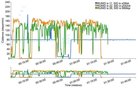 In addition to the backend, we designed a dashboard that provides a way to visualize the data about the runs. The dashboard can be accessed on the web using a browser. Figure 4 depicts an example plot of cadence data for three different runs by three different subjects. In the runs reported in Figure 4, runner s28ikk reported holding the phone in his hand during run 11, contrary to the instructions given to the subjects to place the smartphone around the hip or on the shoulder during the run. In all of the runs in the figure, we observe that the runners stopped momentarily, which is corroborated by the other data variables (e.g., speed, GPS, etc.). This explains the seemingly low cadence readings in these figures. These issues will be discussed further in Section 5.