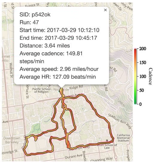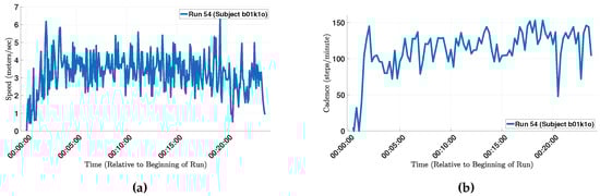 In another example, a subject reported that “My measured cadence was also lower than expected—I was mostly running on beat to songs that had 150+ bpm”. The measured cadence of the run is depicted in Figure 9b. The average cadence of the run was 111 steps/min, which includes the segments in the beginning of the run as well as some segments when the runner slowed down (or perhaps momentarily stopped running). After excluding these data points, the average increased to 124 steps/min, which is still lower than the subject’s self-reported cadence of 150 steps/min. For reference, Figure 9a depicts the speed during the same run, which shows that the runner would slow down in many instances. One potential reason for those momentary slow-downs is the urban path that the runner selected, which is corroborated by the run’s GPS data (the path passed through many street intersections).