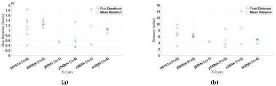(a) The durations of the different runs as observed in each subject (); and (b) the total distances of the different runs as observed in each subject ().