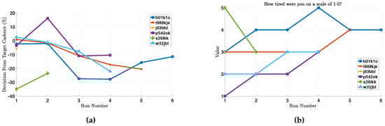 (a) The deviation of the average cadence from the target cadence for each run, expressed in percentage points (); and (b) subject-reported level of fatigue after each run. A value of three represents the level of fatigue reported after an average run; a value of one is least fatigued; and value five is most fatigued after an average run ().