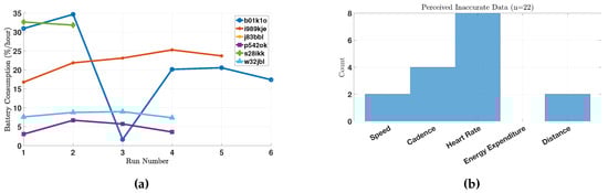 (a) The amount of battery consumption (in %) per hour during the different runs by the different subjects (); and (b) the perceived accuracy of the collected data by the runners .