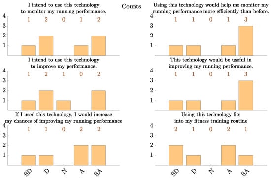 In Figure 10 we present the results of the acceptability portion of the post-study questionnaire. It is worth noting that the study subjects’ acceptability of this technology is lower than the acceptability reported in other telemonitoring applications such as in congestive heart failure (CHF) [,]. This can be attributed to multiple factors. First, some subjects voiced preference for using a monitoring device with a smaller form factor than a smartphone for this application. For example, one subject stated: “I’m a big fan of using running watches instead of phone apps because the form factor is much more comfortable. That’s the main reason I was so negative about using a phone-based athletic trainer”. In that regard, we note that the Berkeley Telemonitoring framework supports general Android devices, not only Android smartphones. Therefore, an Android smart watch application can be implemented using the same framework, averting the form factor challenge. Second, people may be more likely to tolerate certain drawbacks in a technology if they perceive a higher utility and value in it. As such, the higher levels of acceptability in CHF telemonitoring and intervention (e.g., []) may be attributed to the potentially higher perceived utility and value of the technology to the subjects in that application [].