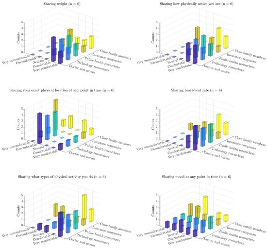 Another aspect of the post-study questionnaire focused on the privacy aspects of the technology, as perceived by the subjects. In that portion of the questionnaire, the subjects were asked the following set of questions. “Sometimes the smartphone might automatically record, or ask you to report, specific kinds of information about your health or behavior, such as your weight, your mood, or your blood pressure. The following questions will help us understand how comfortable you are with the idea of other people knowing these things about you”. In Figure 11 we present the subjects’ responses indicating their levels of comfort in sharing data about their (i) weight; (ii) level of physical activity; (iii) exact physical location at any point in time; (iv) heart-beat rate; (v) types of physical activity they do; and (vi) mood at any point in time, with: (i) doctors and nurses who provide them healthcare; (ii) researchers who study athletic training technology; (iii) public health professionals who study the effects of exercise and athleticism; (iv) insurance companies that set their health insurance prices; and (v) close family members who care about their health [].