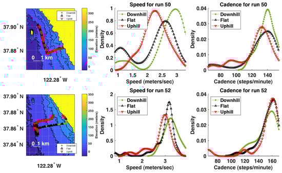 It is interesting to understand whether runner’s speed or cadence change as a result in elevation changes during the run. That is, we ask whether cadence or speed drop as a result of running uphill and whether they increase as a result of running downhill, relative to the cadence and speed during running on a flat surface. This type of analysis can be beneficial in analyzing the performance of each runner for each run. In order to perform this analysis, we split each run into segments of one minute each. Each segment was defined as “running uphill” if the net change in elevation is at least m. Each segment was defined as “running downhill” if the net change in elevation is at most m. All other segments were marked as running on flat surface. In order to estimate elevation for each data point, we used the Digital Terrain Elevation Data (DTED) maps from the United States Geological Survey (USGS) [] to estimate the elevation of each GPS data point during the run.