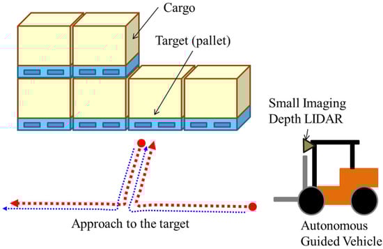 Example of an assumed scenario for Automated Guided Vehicles (AGVs). An AGV equipped with a small imaging depth LIDAR automatically approaches a pallet and transports the pallet to another location.